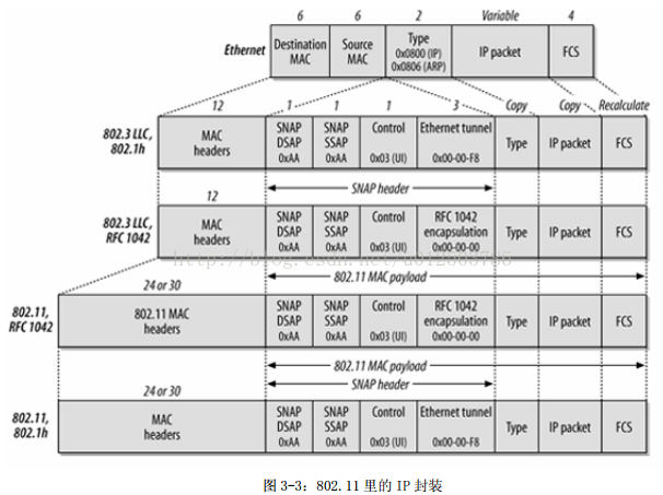 - 从802.11data位里的SNAP标头,将TYPE类型代码复制到以太网帧里的type位。如果该以太网帧亦使用SNAP,就复制整个SNAP标头
