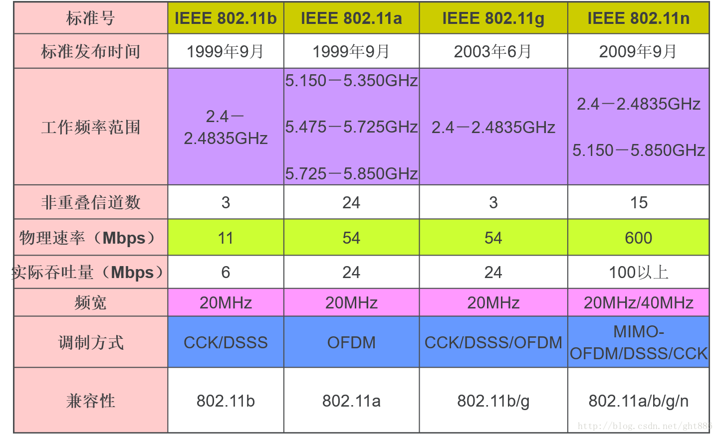 802.11a:1999年,IEEE 802.11a标准制定完成,该标准规定无线局域网工作频段在5GHz,数据传输速率达到54Mbps, 传输距离控制在10~100米。802.11a采用正交频分复用(OFDM)的独特扩频技术;可提供25Mbps的无线ATM接口和10Mbps的以太网无线帧结构接口,以及TDD/TDMA的空中接口;支持语音、数据、图像业务;一个扇区可接入多个用户,每个用户可带多个用户终端。