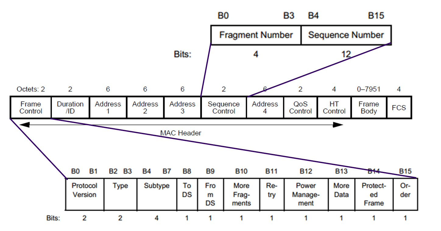 - MMSDU(MAC Management Server Data Unit), 4位片段号(Fragment Number)组成,数据包分片的序号。