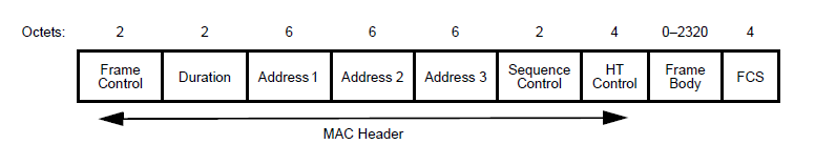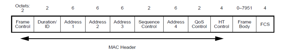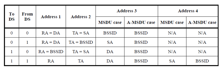 其中Address 1代表目的地址,Address 2代表原地址,Address 3 代表BSSID(Basic Set ID)。