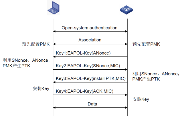 WPA-PSK通过Pre-shared key进行认证,以Pre-shared key作为PMK(pairwise master key成对主秘钥)协商临时加密。无线终端预先配置Key,通过AP-AC四次握手协商验证无线终端侧Key的合法性。产生PTK和GTK用来加密无线报文。