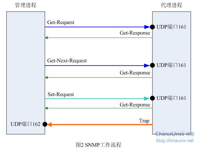 上面五种消息中Get-Request、Get-Next-Request和Set-Request是由管理站发送到代理侧的161端口的;后面两种Get-Response和Trap 是由代理进程发给管理进程的,其中Trap消息被发送到管理进程的162端口,所有数据都是走UDP封装。