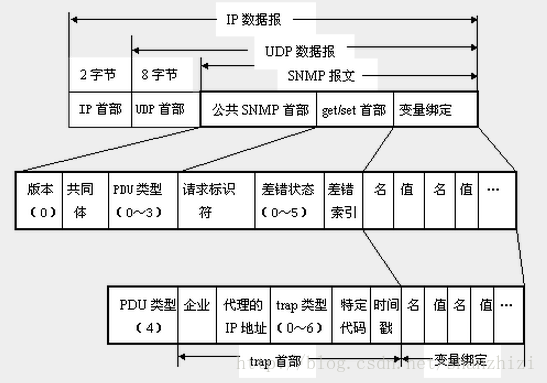下图是封装成UDP数据报的5种操作的SNMP报文格式。一个SNMP报文共有三个部分组成,即公共SNMP首部、get/set首部或者trap首部、变量绑定。