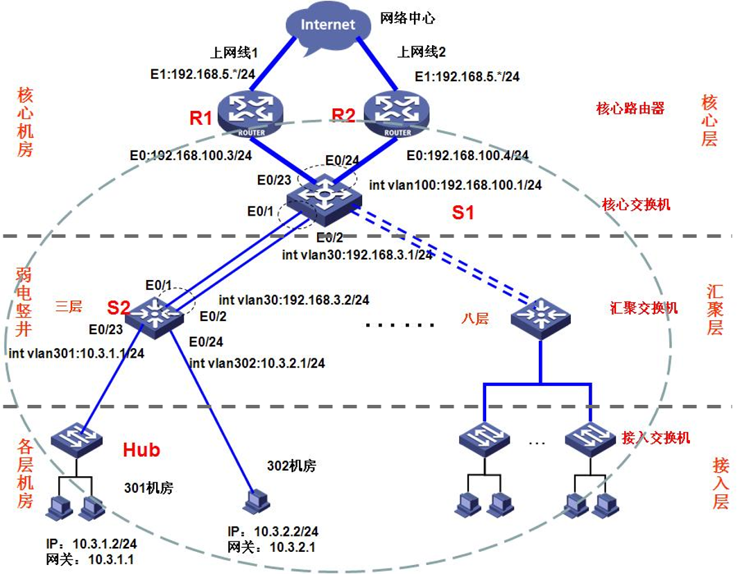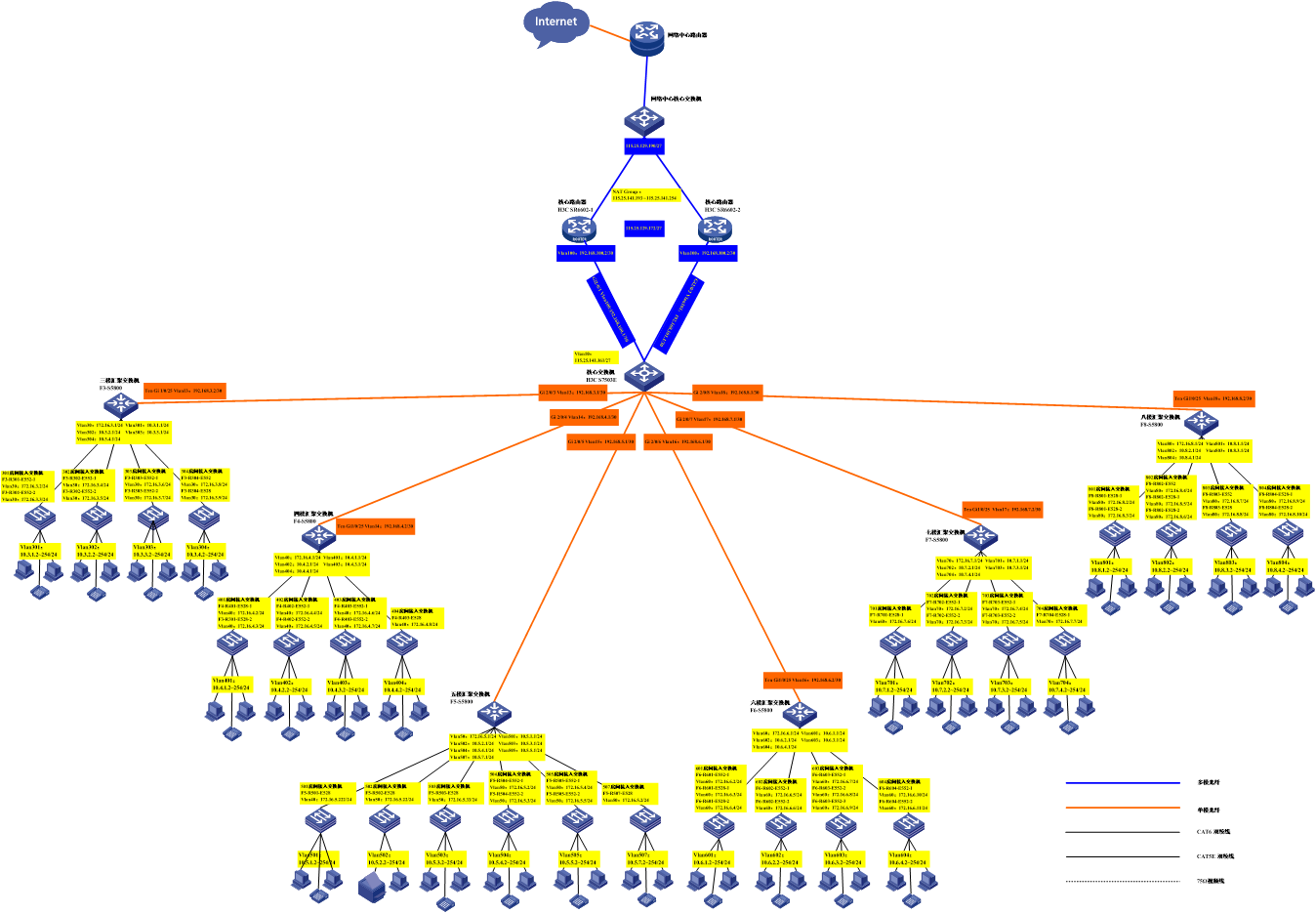 - 不同层次使用不同级别的千兆交换机,出口路由器采用中高端路由器
