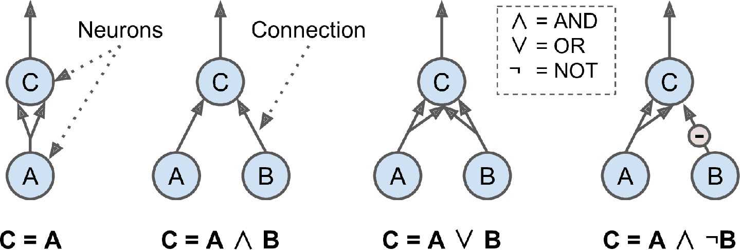 A或神经元B被激活(或两者),神经元C被激活。最后,如果我们假设输入连接可以抑制神经元的活动(生物神经元是这样的情况),那么第四个网络计算一个稍微复杂的逻辑命题:如果神经元