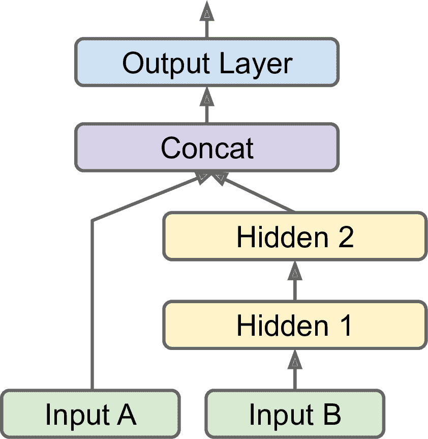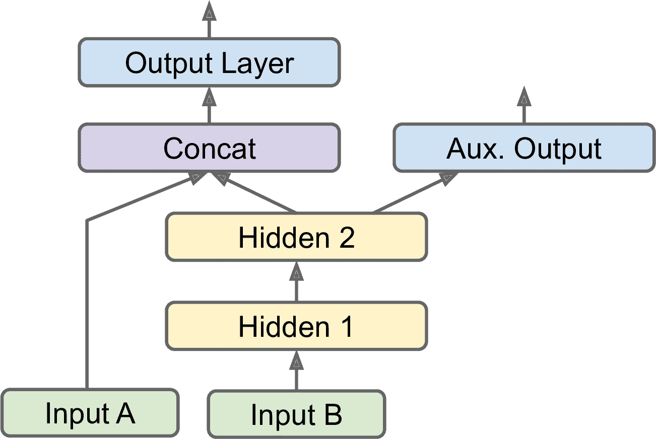 MLP 也可以处理多标签二元分类(见第 3 章)。例如,邮件分类系统可以预测一封邮件是垃圾邮件,还是正常邮件,同时预测是紧急,还是非紧急邮件。这时,就需要两个输出神经元,两个都是用 Logistic 函数:第一个输出垃圾邮件的概率,第二个输出紧急的概率。更为一般的讲,需要为每个正类配一个输出神经元。多个输出概率的和不一定非要等于 1。这样模型就可以输出各种标签的组合:非紧急非垃圾邮件、紧急非垃圾邮件、非紧急垃圾邮件、紧急垃圾邮件。