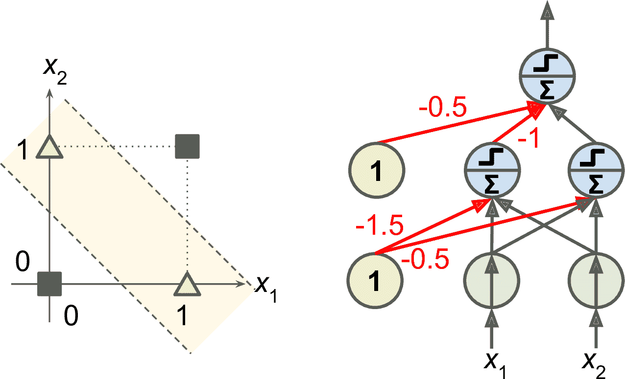 然而,事实证明,感知机的一些局限性可以通过堆叠多个感知机消除。由此产生的人工神经网络被称为多层感知机(MLP)。特别地,MLP 可以解决 XOR 问题,你可以通过计算图 10-6 右侧所示的 MLP 的输出来验证输入的每一个组合:输入(0, 0)或(1, 1)网络输出 0,输入(0, 1)或(1, 0)它输出 1。除了四个连接的权重不是 1,其它连接都是 1。