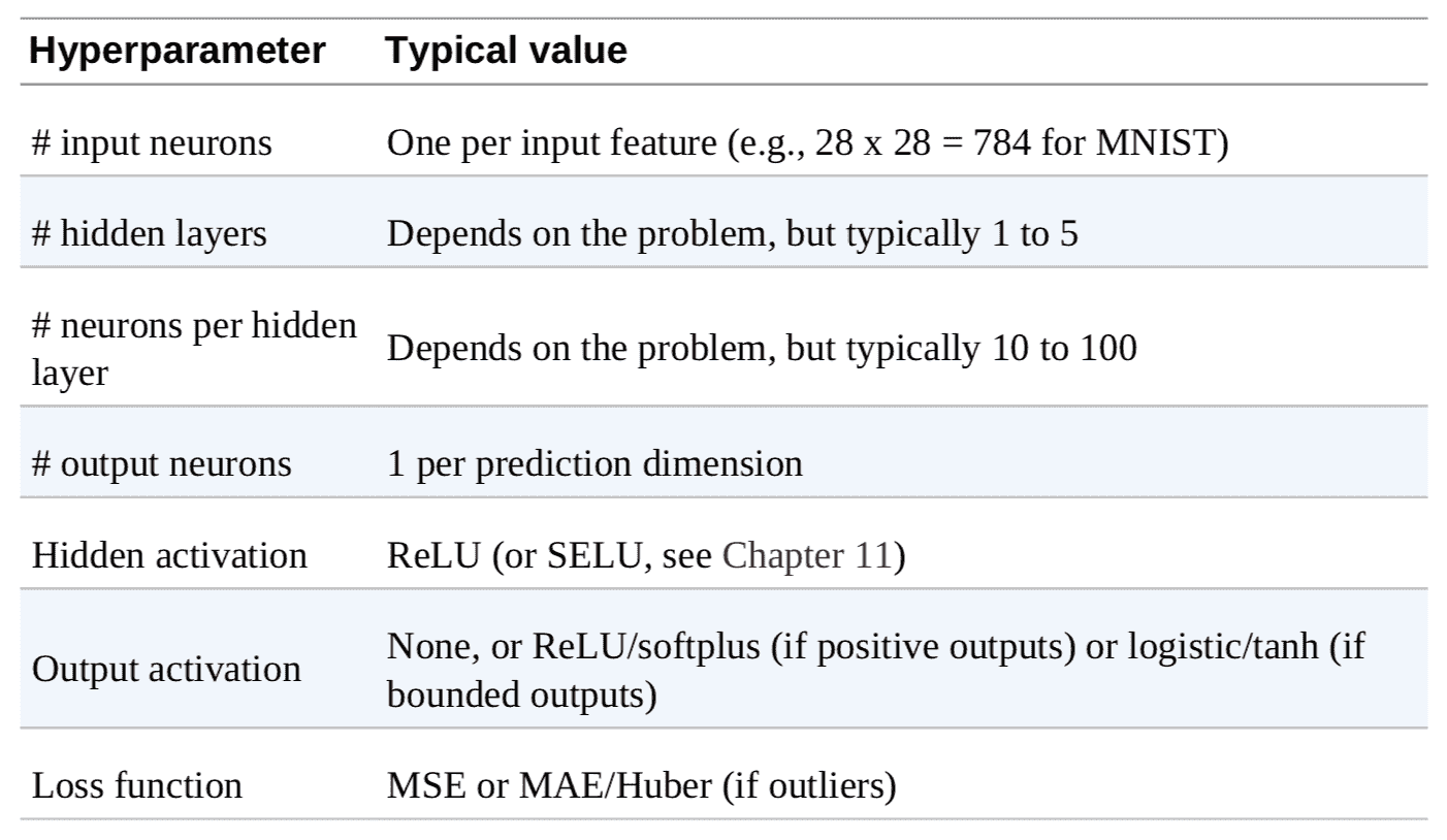 表 10-1 总结了回归 MLP 的典型架构。