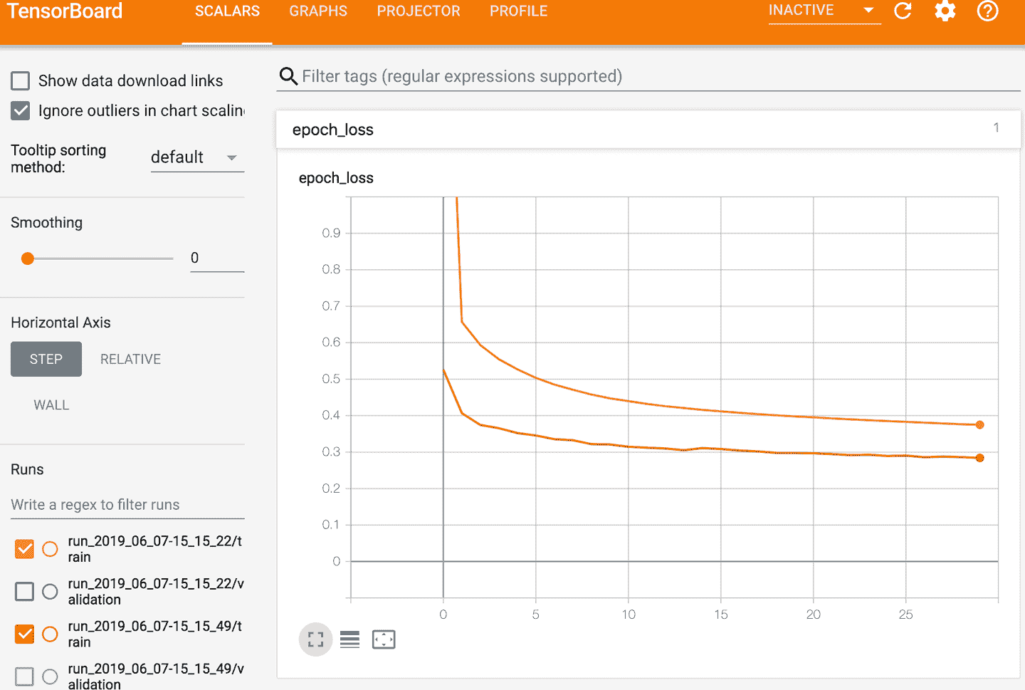 无论是使用哪种方式,都得使用 TensorBoard 的浏览器界面。点击栏SCALARS可以查看学习曲线(见图 10-17)。左下角选择想要可视化的路径(比如第一次和第二次运行的训练日志),再点击epoch_loss。可以看到,在两次训练过程中,训练损失都是下降的,但第二次下降的更快。事实上,第二次的学习率是 0.05(optimizer=keras.optimizers.SGD(lr=0.05))而不是 0.001。
