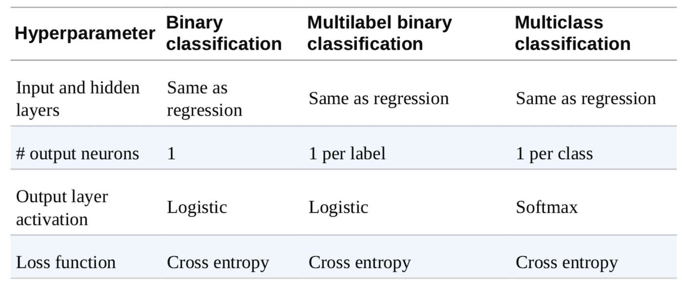 表 10-2 概括了分类 MLP 的典型架构。