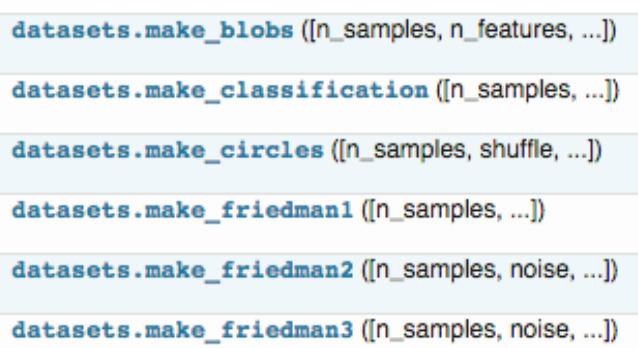 1.2 创建数据集 你除了可以使用sklearn自带的数据集,还可以自己去创建训练样本,具体用法参见《Dataset loading utilities》,这里我们简单介绍一些,sklearn中的samples generator包含的大量创建样本数据的方法
