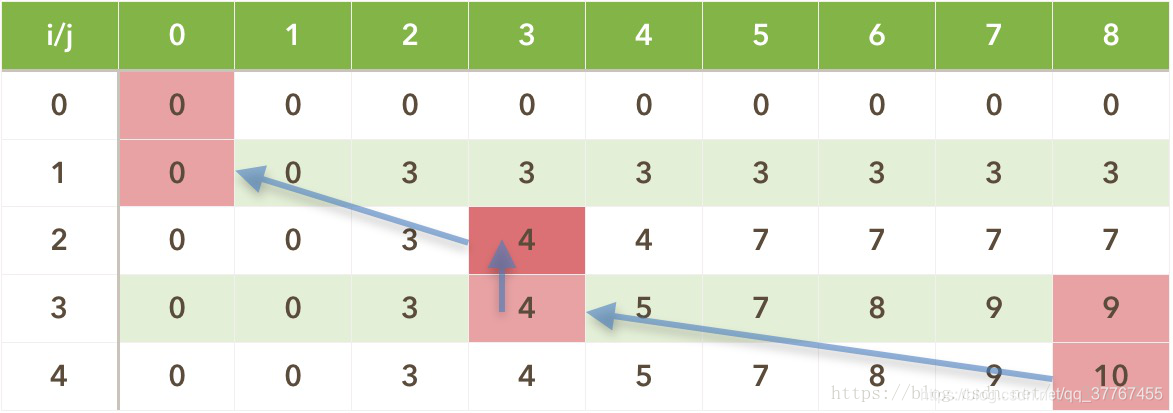 - 问题分解划分阶段:2个规模增长方向。背包的容量和物品。背包的个数增长i=1,2,3,n。背包容量为j。第一个阶段表示是否添加物品。第二个阶段是背包容量的增长。