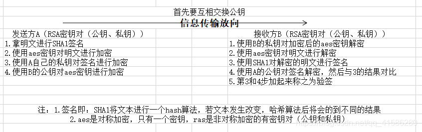 有两组四个密钥:A的公钥(PUB_A),A的私钥(PRI_A);B的公钥(PUB_B),B的私钥(PRI_B)。公钥一般用来加密,私钥用来签名。通常公钥是公开出去的,但是私钥只能自己私密持有。