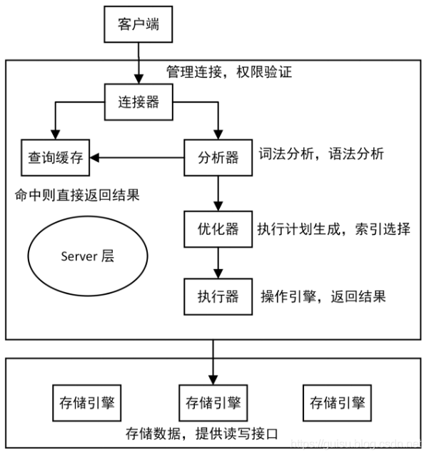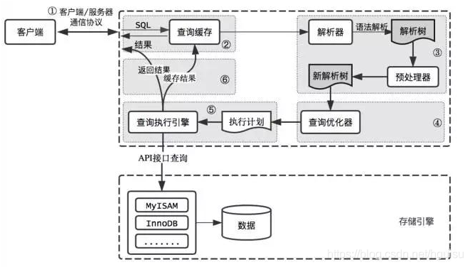 - 缓存:服务器首先检查查询缓存,如果命中缓存,则立刻返回存储在缓存中的结果,否则进入下一阶段