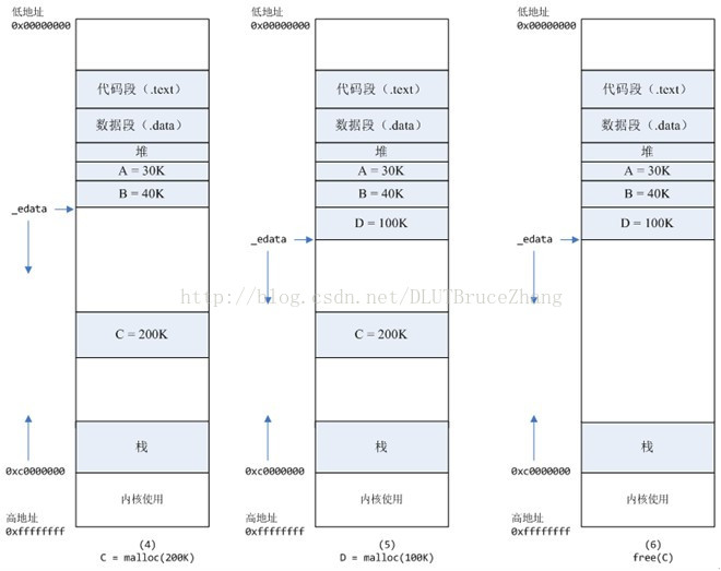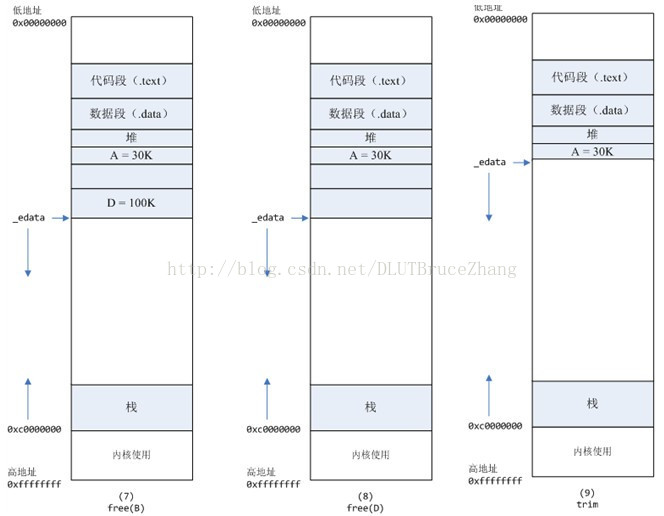 - B对应的虚拟内存和物理内存都没有释放,因为只有一个_edata指针,如果往回推,那么D这块内存怎么办呢?