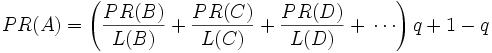 由于存在一些出链为0,也就是那些不链接任何其他网页的网, 也称为孤立网页,使得很多网页能被访问到。因此需要对 PageRank公式进行修正,即在简单公式的基础上增加了阻尼系数(damping factor)q, q一般取值q=0.85。其意义是,在任意时刻,用户到达某页面后并继续向后浏览的概率。 1- q= 0.15就是用户停止点击,随机跳到新URL的概率)的算法被用到了所有页面上,估算页面可能被上网者放入书签的概率。最后,即所有这些被换算为一个百分比再乘上一个系数q。由于下面的算法,没有页面的PageRank会是0。所以,Google通过数学系统给了每个页面一个最小值。