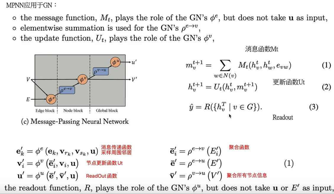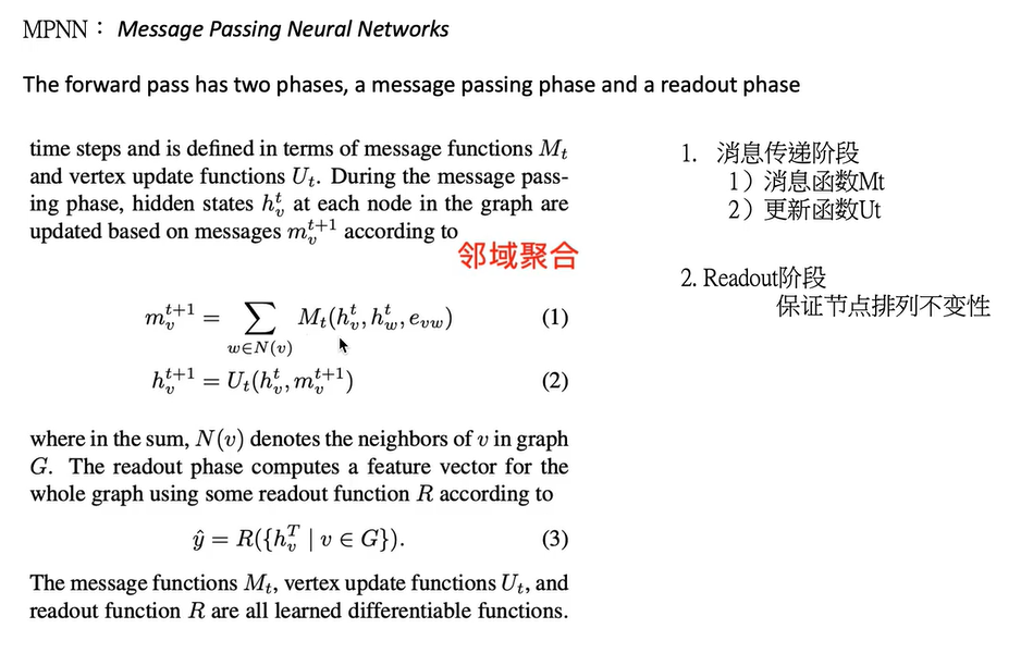- MPNN分两个阶段,消息传递阶段和Readout阶段,readout阶段可以读出整个网络的特征向量,用于图分类,这个很关键。现在缺的两个部分之一。