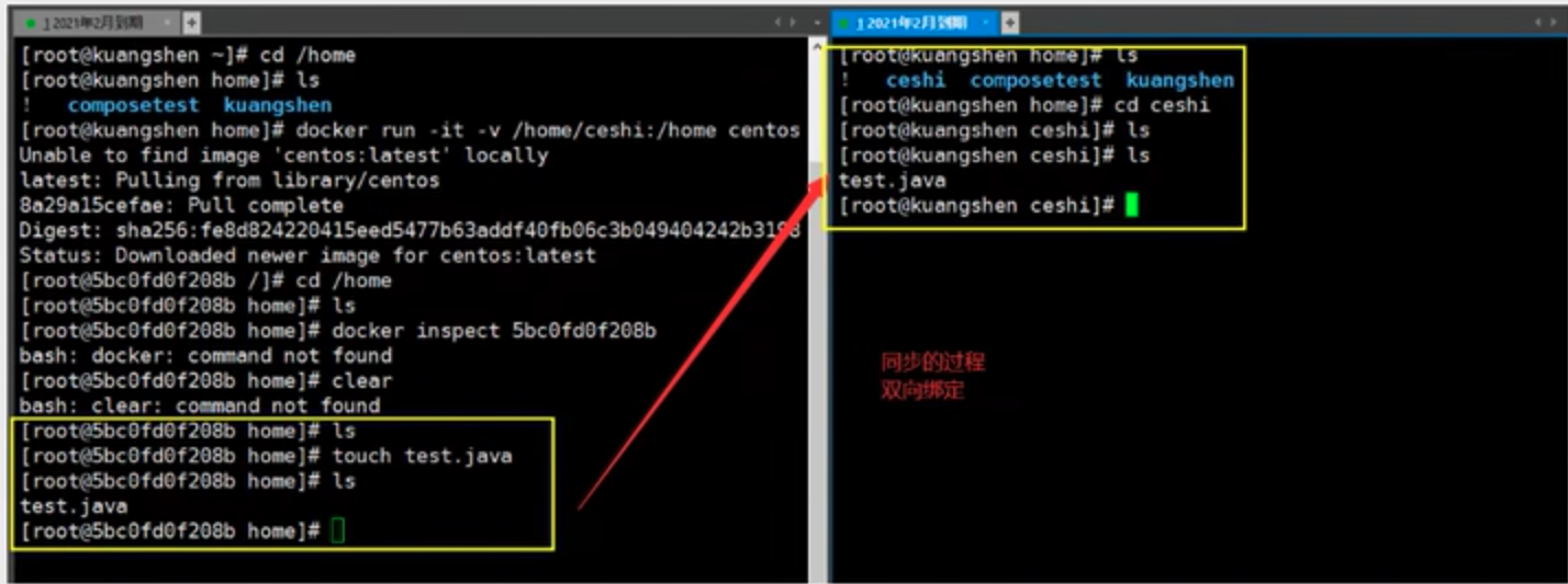 同步的过程,是一种双向绑定的过程。容器停止后,修改主机文件,再启动容器的时候,数据同样改变