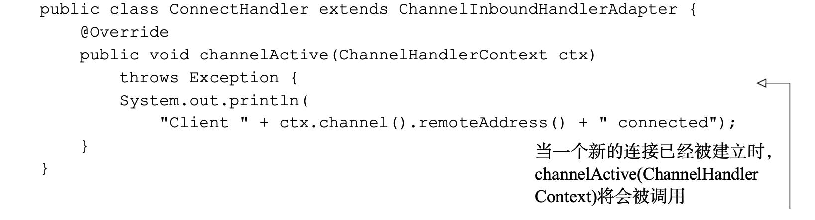 通过回调机制处理事件。当一个新的连接已经被建立时, ChannelHandler的 channelActive()回调方法将会被调用,并将打印出