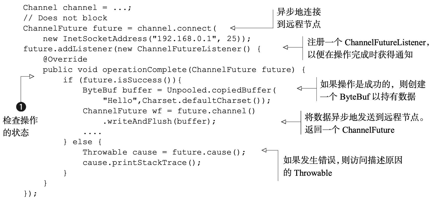 ChannelFuture提供了几种额外的方法,这些方法使得我们能够注册一个或者多个 ChannelFutureListener实例。监听器的回调方法operationComplete(),将会在对应的 操作完成时被调用 。