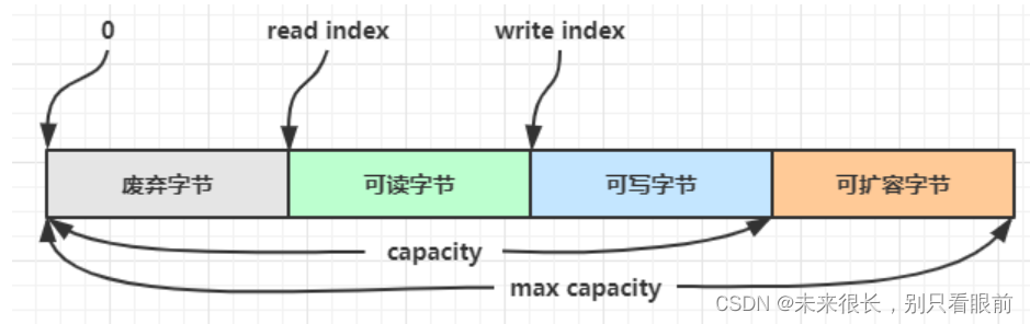 最开始读写指针都在 0 位置;不用像NIO一样需要开发人员切换读写模式,而且这个ByteBuf还是动态扩容;扩容不能超过 max capacity 会报错。选择下一个 2^n容量。