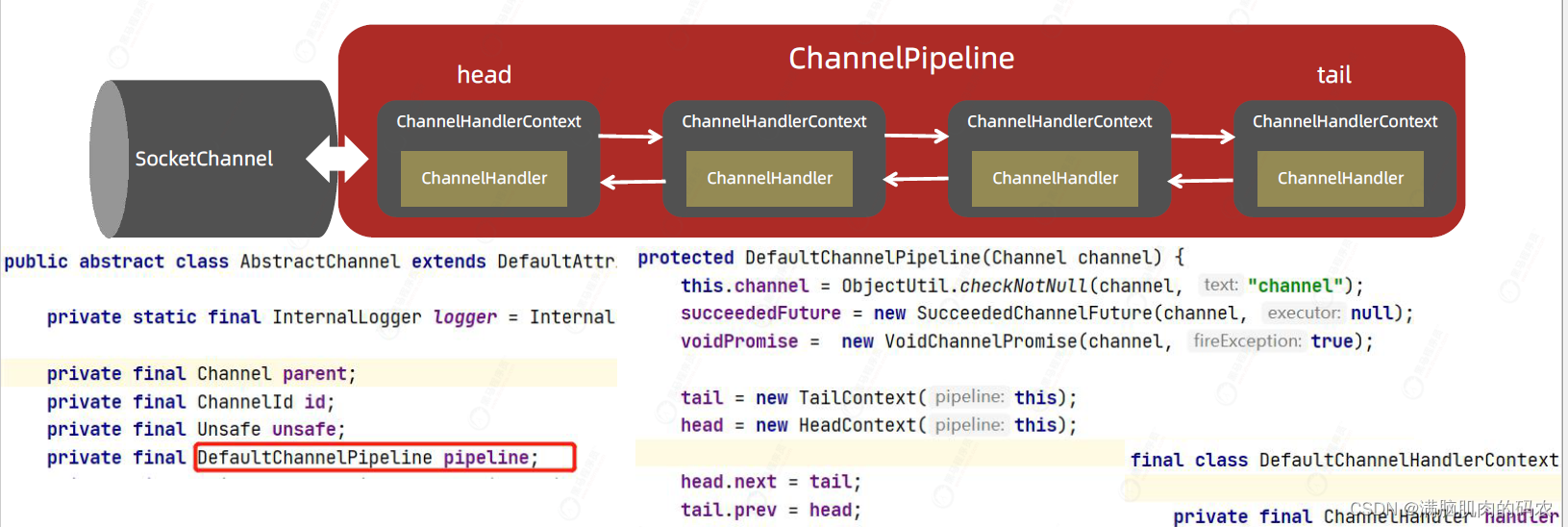 - ChannelHandlerContext,用于传输业务数据。ChannelPipeline,用于保存处理过程需要用到的ChannelHandler和ChannelHandlerContext。