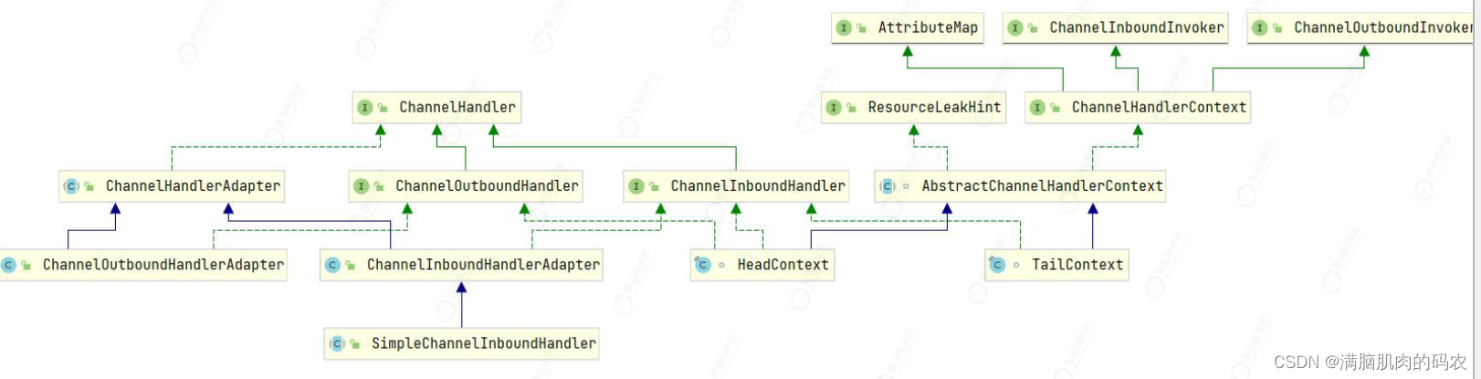 - ChannelDuplexHandler:混合型,既能处理入站事件又能处理出站事件。从下面的关系图可以看出,如果我们需要自己的Handler的时候,