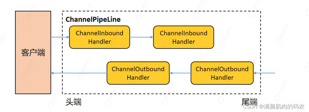 处理器ChannelHandler:ChannelPipeline 提供了 ChannelHandler 链的容器。以服务端程序为例,客户端发送过来的数据要接收,读取处理,我们称数据是入站的,需要经过一系列Handler处理后;如果服务器想向客户端写回数据,也需要经过一系列Handler处理,我们称数据是出站的。ChannelPipeline 和 ChannelHandler 之间是相互绑定的,也就是一对一关系。
