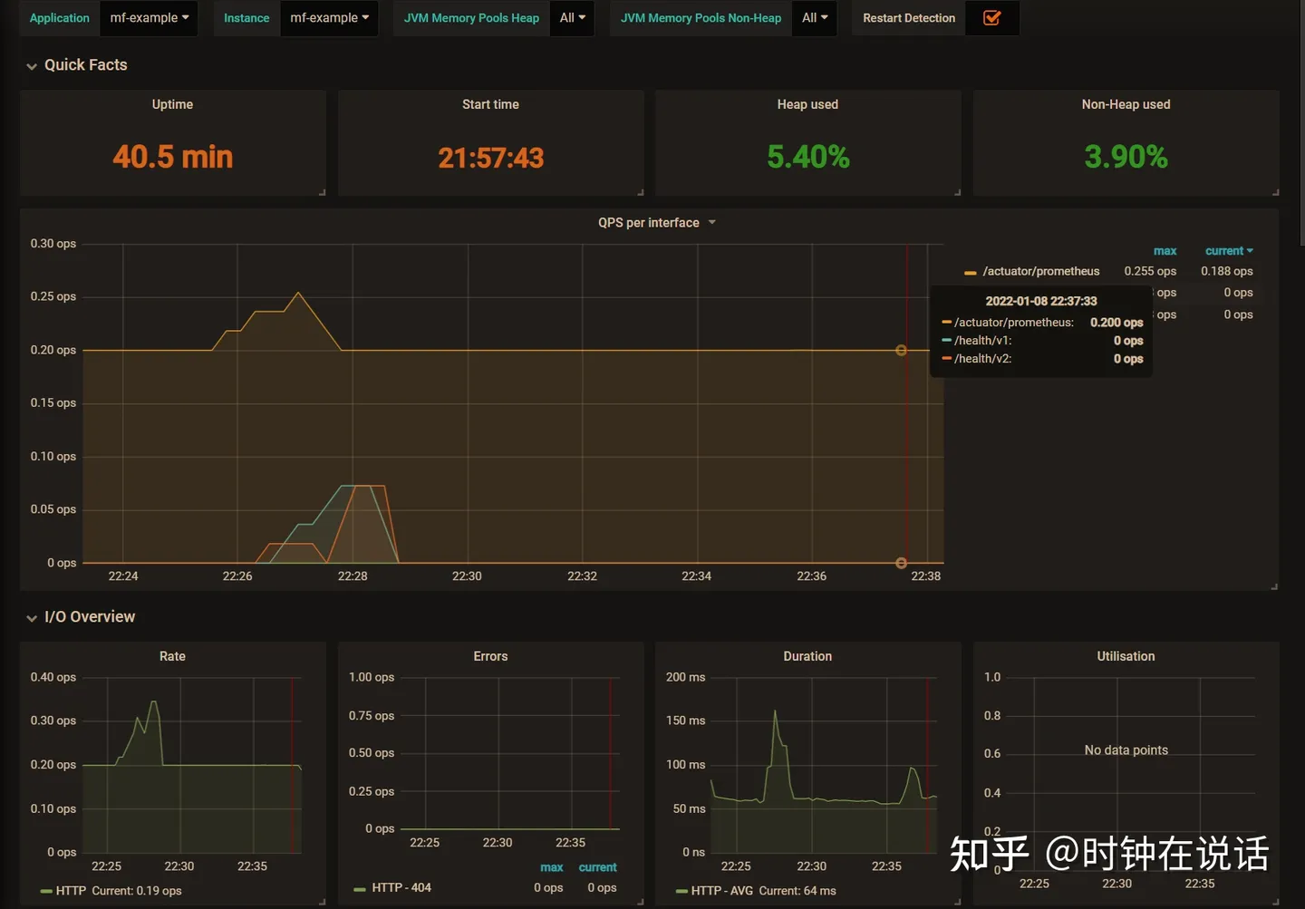 String openMetricsScrape = registry.scrape(TextFormat.CONTENT_TYPE_OPENMETRICS_100);图形化展示。将 Prometheus 抓取的指标数据展示到 Grafana 面板中,下图使用的是官方公开的一种 Grafana dashboard 模板(JVM-dashboard)