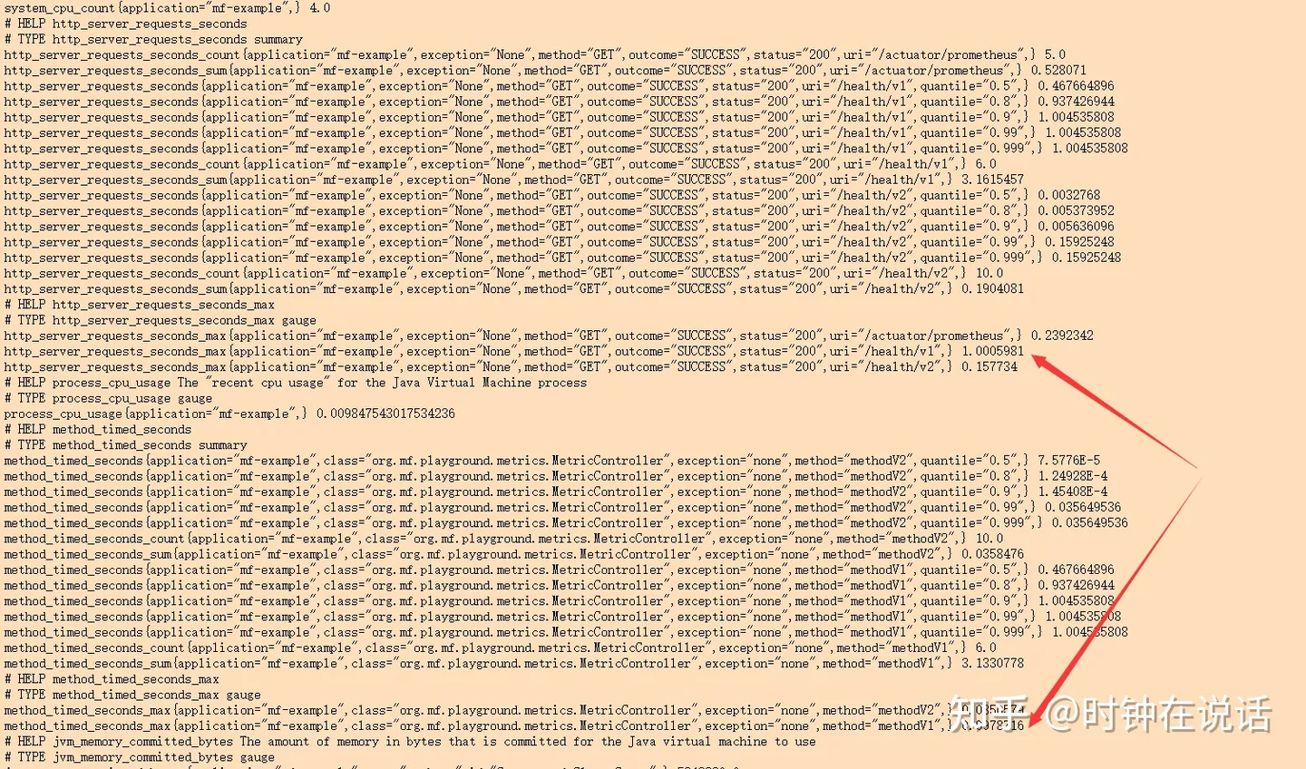 加入TimedAspect后的指标数据统计情况,可以看到同时记录了method_timed_seconds和http_server_requests_seconds两种名称的指标数据。并且这两种统计方式显示的接口耗时有一定误差,从执行流程上来看,使用TimedAspect方式计算耗时更接近方法本身逻辑执行占用时间