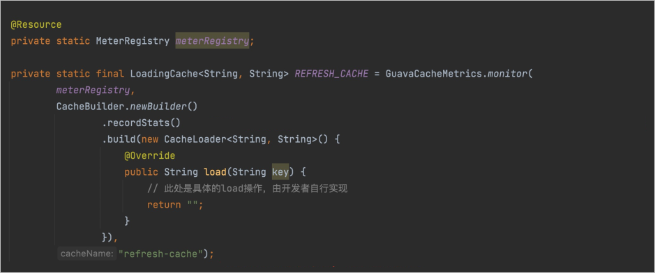 - 使用工具类API包装本地缓存,即如下图中的GuavaCacheMetrics.monitor。
