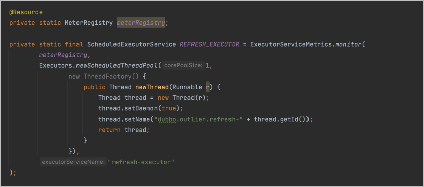 在开发过程中还会涉及许多业务强相关的自定义指标,为了监测这些指标,在往Bean中注入MeterRegistry后,您还需要按照需求和对应场景构造Counter、Gauge或Timer来进行数据统计,并将其注册到MeterRegistry进行指标暴露,示例如下。